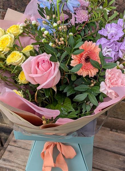 Send some love this Mother's Day with this beautiful hand tied bouquet of seasonal pastel blooms. This includes scented stock, delicate delphinium, rose and spray rose.