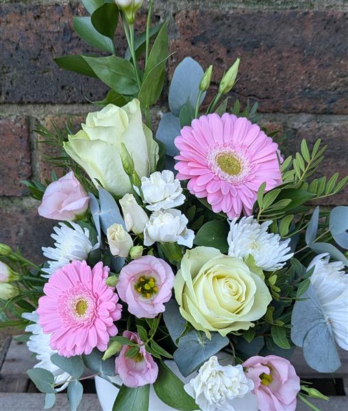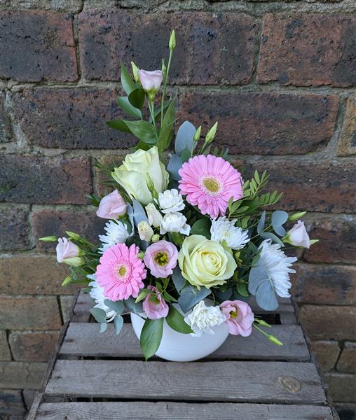 Pretty pink and white arrangement in a ceramic pot, created in floral foam, includes roses and germini with lisianthus, perfect for celebrating a new born or easy care birthday gift