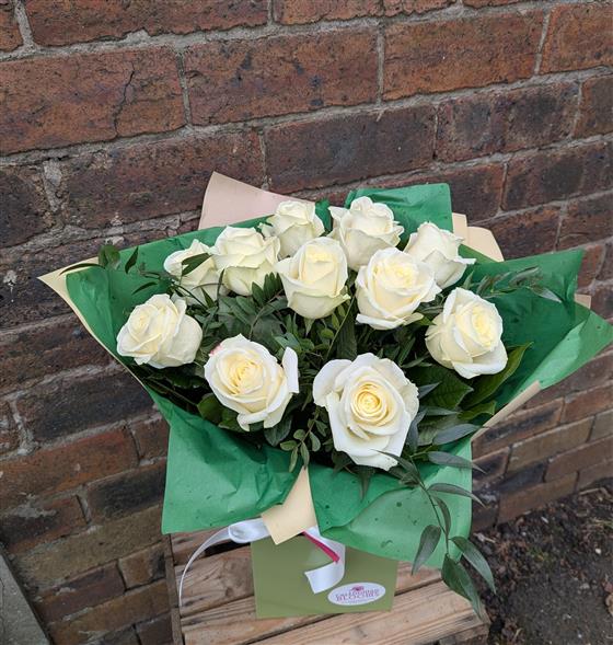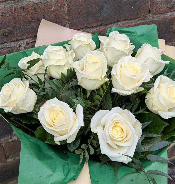 12 large-headed white roses, nestled in seasonal foliage, arranged in water and gift box, beautifully simple arrangement