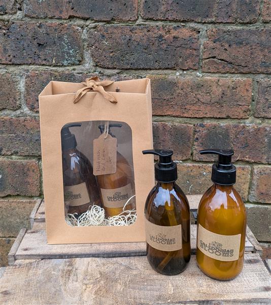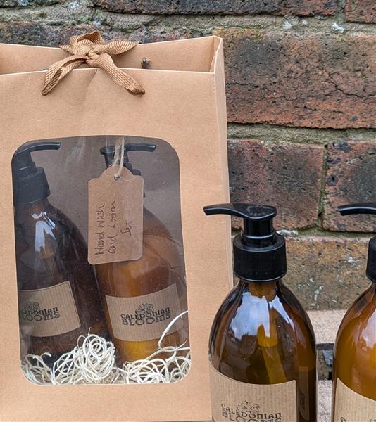 Brown glass refillable bottles, with luxury soap and lotion, available in 3 different scents. A beautiful gift to add to any floral order, packaged beautifully in a craft bag with straw.