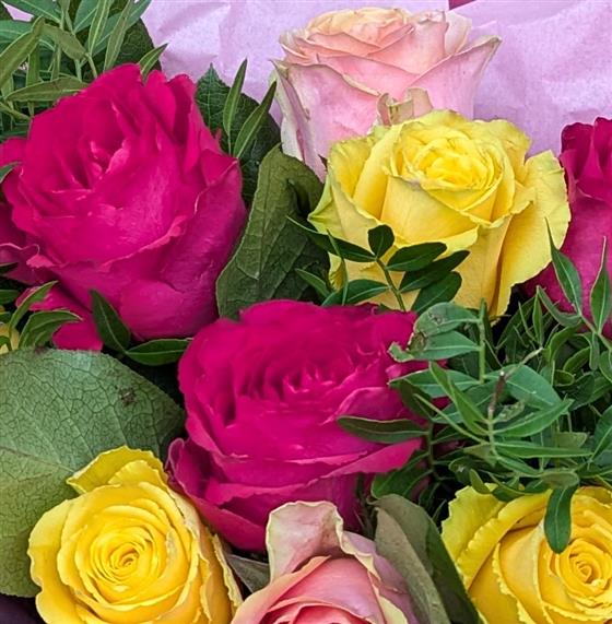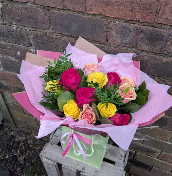 12 mixed coloured large headed roses, hand tied with seasonal foliage, beautifully gift wrapped in water in a gift box