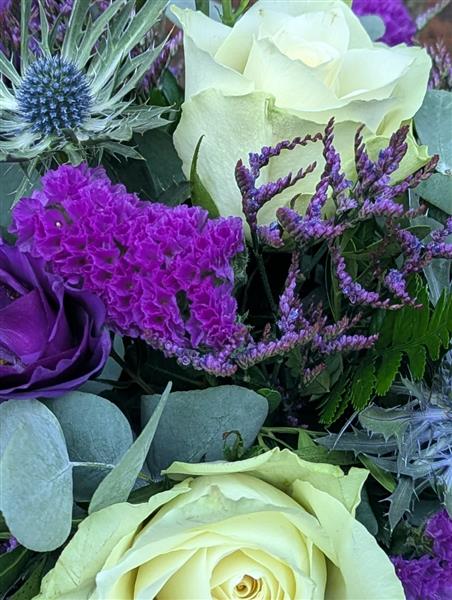 Scottish design of white roses, thistles and complimentary purples create our ever popular hatbox arrangement, is made in floral foam, no fuss, easy to look after.