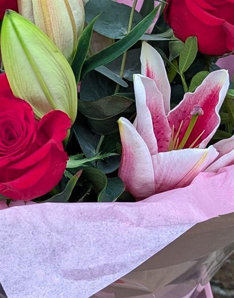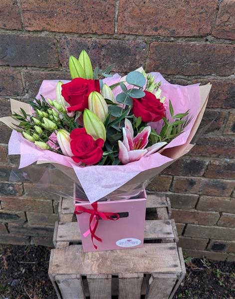A beautiful selection of large headed roses, oriental lilies and lisianthus create this modern hand tied arrangement, this comes gift wrapped and in a gift box.