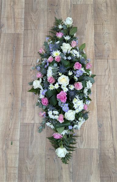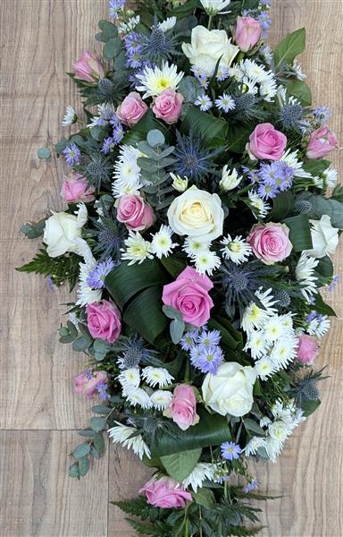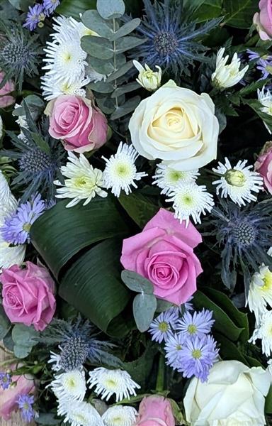 A selection of white and pink roses with thistles finished with chrysanths and asters. Traditional style of casket spray can be arranged in different colours and sizes