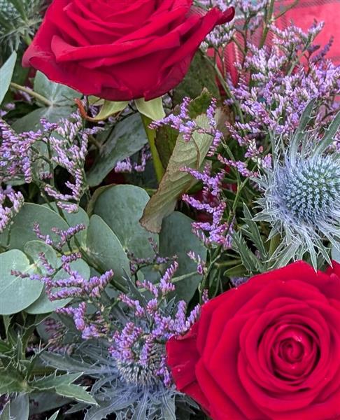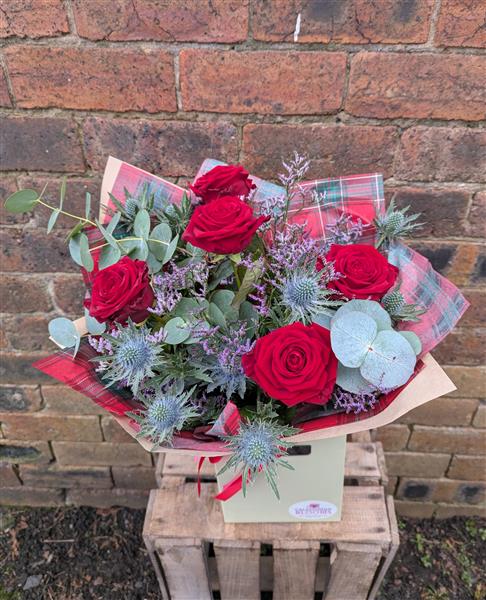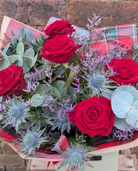 A selection of large headed roses, thistles and limonium gives this gorgeous bouquet a scottish touch. Gift wrapped and arranged in water, in a gift box.