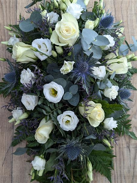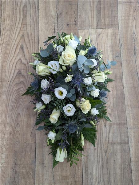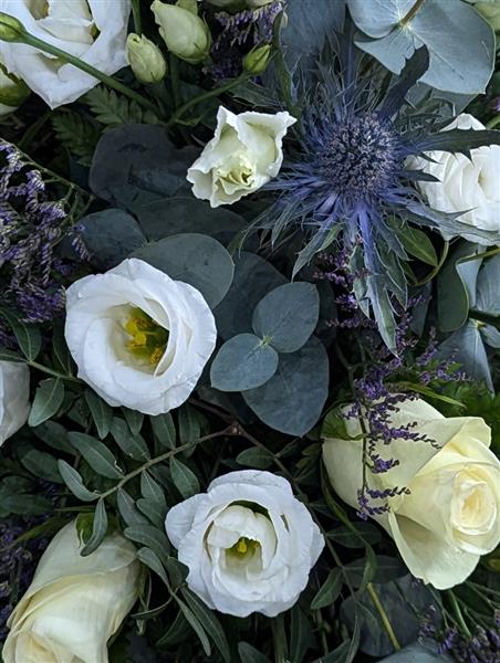 Our popular Scottish Teardrop Spray has white roses, lisianthus, thistles and greenery to compliment