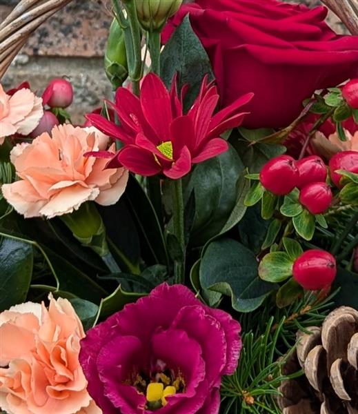A perfect gift for christmas in traditional reds with a touch of peach and dried cones, create this festive basket
