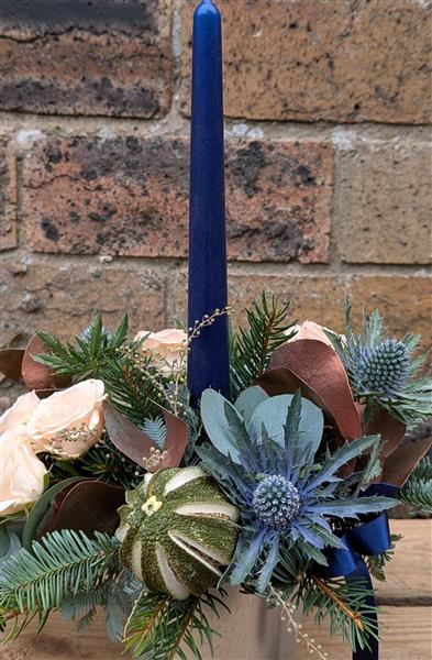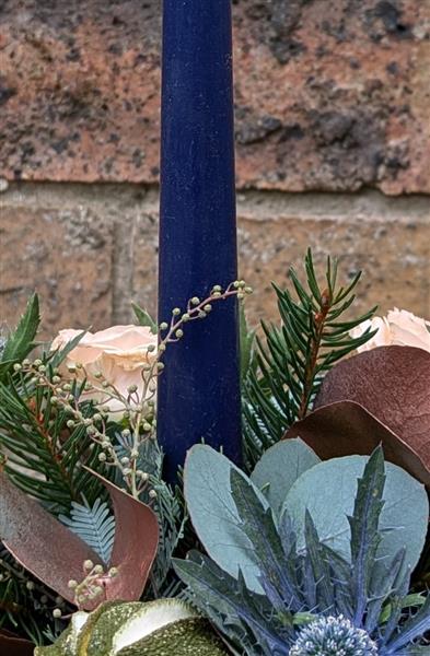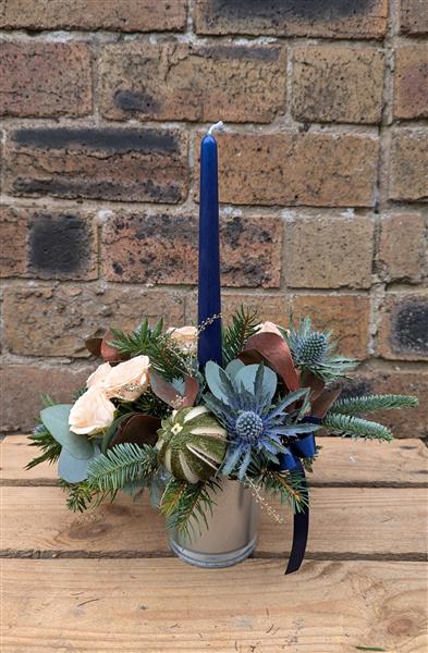 Winter candle arrangement created in foam in a tin pot. Winter peaches and blues with dried fruit and winter foliage complimented with a blue taper candle, a perfect addition to any table